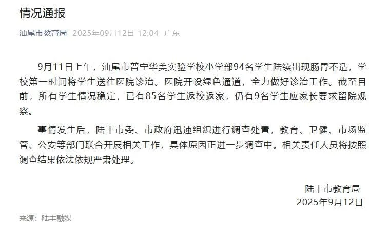 On the afternoon of September 11th, concerns arose across Shanwei, Guangdong, as multiple students at the Puning Huamei Experimental School began showing symptoms of gastrointestinal distress. This sudden event sent 94 young students rushing to local hospitals for urgent care, sparking widespread concern among parents, educators, and local authorities.