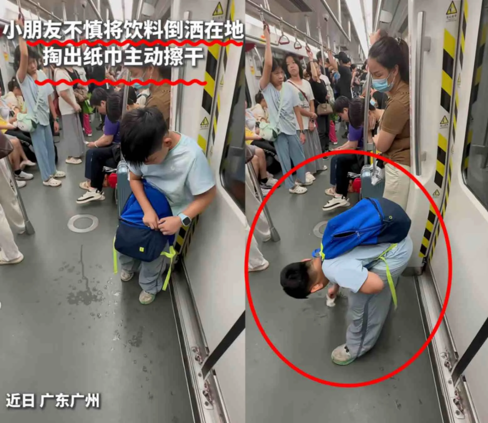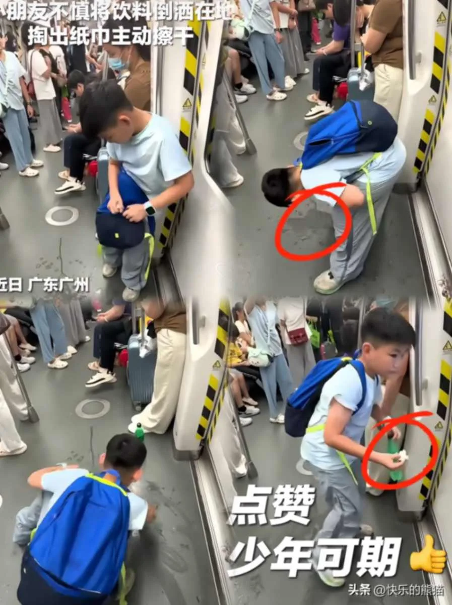 On a bustling day in Guangzhou, something quietly extraordinary happened on the metro. A young boy, barely ten years old, accidentally spilled his drink. Most might expect embarrassment, denial, or simply ignoring the mess. But instead, this little hero took out a few tissues from his schoolbag and carefully wiped up the spill himself. What’s even more striking? He didn’t just leave the used tissues on the floor. He held onto them patiently, making sure they found their way into a trash can. Now, that’s some serious responsibility! 😊