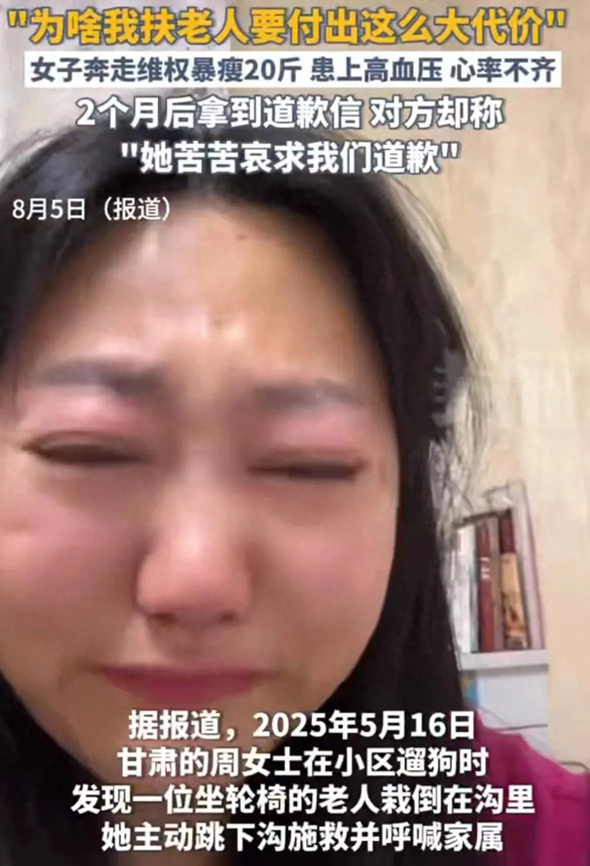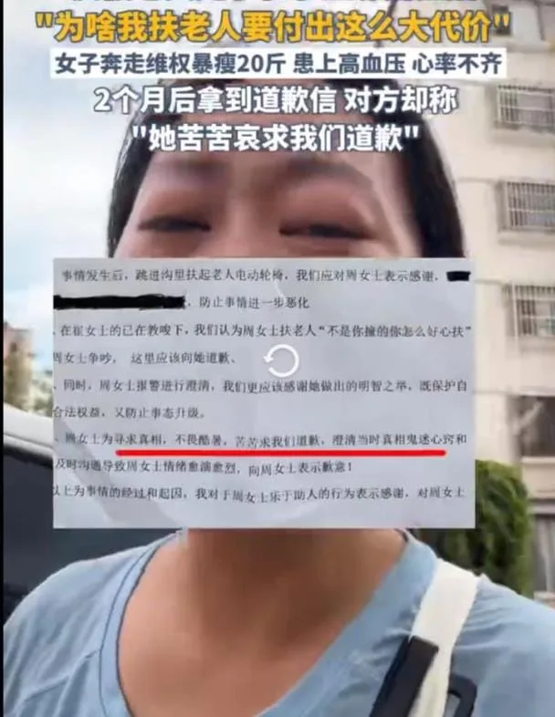 After the police verified her innocence with surveillance footage, the fight was far from over. Ms. Zhou spent two grueling months trying to get an apology, all the while losing 22 jin (~11 kg) and suffering from serious health problems like high blood pressure and arrhythmia. This is the emotional and physical toll of being falsely accused for simply doing the right thing.