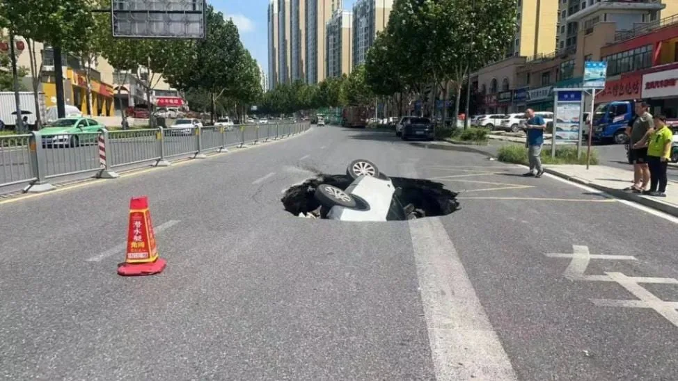 An employee at a nearby shop reported hearing shouts about the collapse, rushing outside to find the SUV swallowed by the asphalt. The event happened precisely at the intersection of Jinning Road and Mengcheng North Road, around 1 p.m.